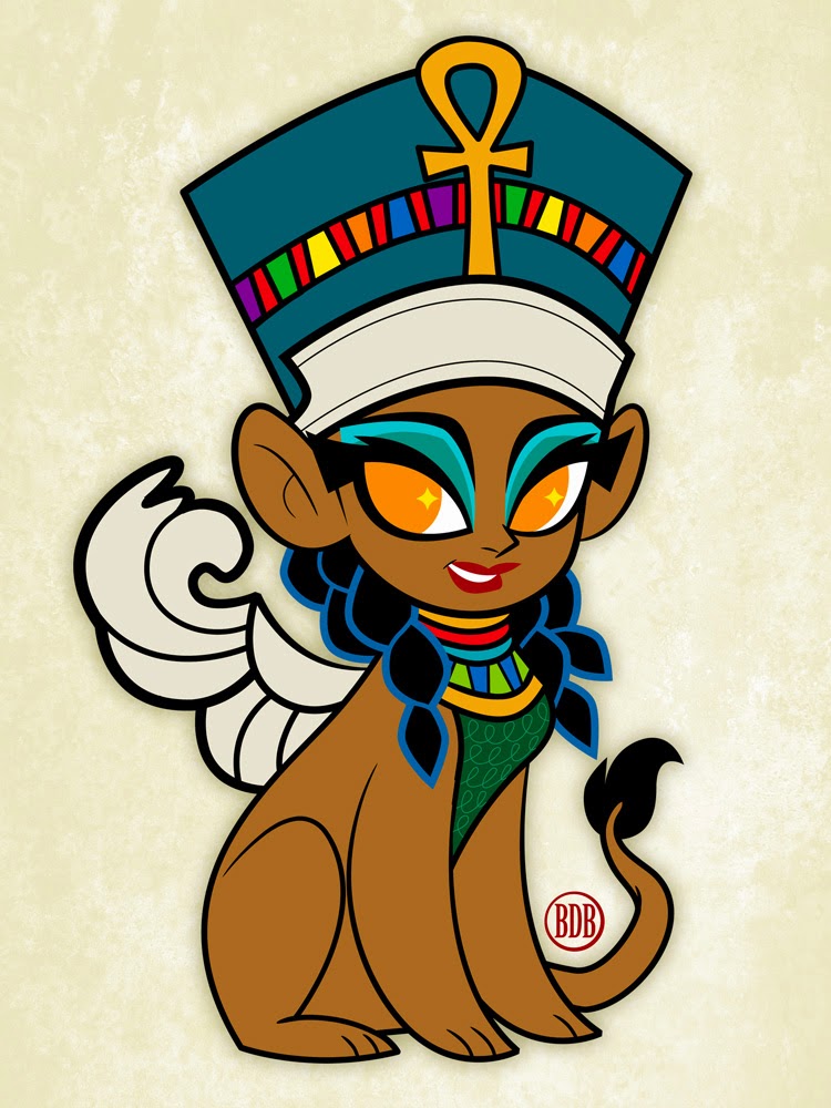 Back in early 2013, I did my version of a Chimera, and expressed interest in doing more mythological creatures in my own cute style. The idea went on the back burner until early 2014, when once again, my interest circled back around. I had a couple of sketches, and had intended for them to be paintings that I would sell at ZaPow gallery. The Sphinx was one of my favorites, so I tried to make it my first painting. I painted it once, abandoned the canvas, started painting it a second time on a different canvas and ultimately abandoned it as well. So I did nothing with this sketch for about a year. Then shortly after Christmas, I decided to do a finished Illustrator version. I'm glad that I did, even though I had some struggles getting through that process. Who knows if I'll do anymore. So technically, this is a late December 2014 piece that I'm finally getting around to sharing here. :P